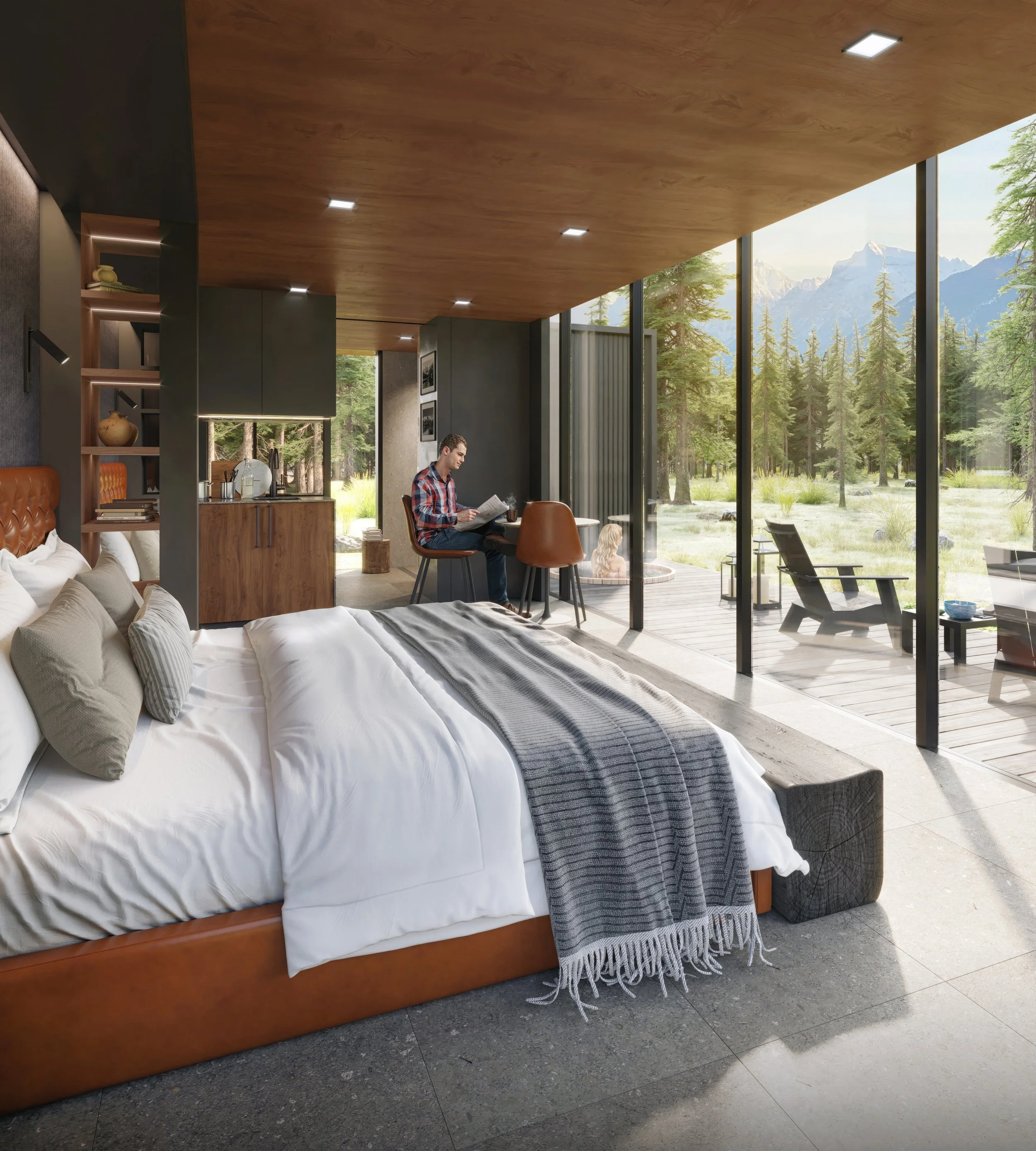 Our lodgings blend cutting-edge design with the tranquility of beautiful natural settings. Features include heated floors, smart home technology, private decks, and stunning glass finishes that immerse you in the surrounding landscape.